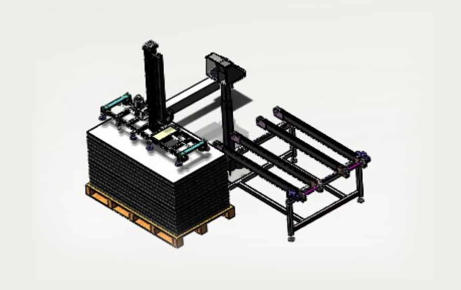 自動排版機(jī)的主要功能單元有:玻璃輸送定位系統(tǒng)、抓取行走系統(tǒng)、視覺檢測系統(tǒng)、電控系統(tǒng)等;通過以上功能單元,實(shí)現(xiàn)了將自動串焊機(jī)串焊好的電池串,按照工藝尺寸要求和排版方向順序自動排版鋪設(shè)到玻璃(EVA已經(jīng)鋪設(shè))上,組成電池串陣列。玻璃/EVA通過傳輸線傳輸至指定位置,機(jī)械手抓取電池串實(shí)現(xiàn)CCD定位、自動旋轉(zhuǎn)、自動排版功能。設(shè)備通過同步帶傳輸與自動生產(chǎn)線對接,實(shí)現(xiàn)了自動流水作業(yè)。